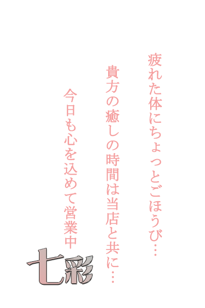 私たちはそんな日々お疲れの貴方様に尽くし、疲れを取り除くべく日々腕に磨きをかけております!!当店自慢のマッサージ技術で是非、気持ち良くなっていただければ幸いでございますそれが私たちの喜びです!